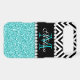 GIRLY MODERN AQUA TEAL BLUE GLITTER (PRINTED PHOTO EFFECT) WITH BLACK AND WHITE CHEVRON PATTERN, MONOGRAMMED WITH YOUR NAME, YOUR INITIAL OR MONOGRAM ON A BLACK STRIPE OR BAND WITH A BORDER OF PRINTED WHITE DIAMONDS. TRENDY, CHIC, COOL CUTE DESIGN FOR HER, THE TRENDSETTER, THE FASHIONISTA. Elke Clarke©