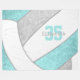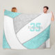 This fun volleyball themed fleece blanket for her features the image of a simple, abstractly oversized aqua, grey and white volleyball that covers the entire blanket - the aqua and grey volleyball panels are blended with a girly floral kaleidoscopic pattern - athlete's name and jersey number are positioned off centre, customisable in coordinating aqua and grey - by katz_d_zynes