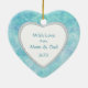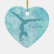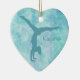 A silhouette aqua girl gymnast does a handstand on one side of this pretty ornament. Her name is at the right of the gymnast figure. Everything is placed on a lighter teal swirl abstract background that has touches of pale lavender. The back of the ornament has a heart shaped white field with more text fields for you to customise. The text field is framed with a faux diamond heart frame, which is then placed on the same aqua swirl background as the front of the ornament. Beautiful and personalised for any girl gymnast!