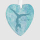 A silhouette aqua girl gymnast does a handstand on one side of this pretty ornament. Her name is at the right of the gymnast figure. Everything is placed on a lighter teal swirl abstract background that has touches of pale lavender. The back of the ornament has a heart shaped white field with more text fields for you to customise. The text field is framed with a faux diamond heart frame, which is then placed on the same aqua swirl background as the front of the ornament. Beautiful and personalised for any girl gymnast!