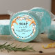 Aqua blue colour Homemade sea salt soap label with seashells coastal background design with elegant calligraphy font, space for your ingredients, and other details. Your Brand name with a statement made with love by (your name).
