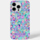 Customize this aqua iridescent leopard print iPhone 15 pro max case with your your name in a trendy modern CAP font in white on light purple. It's so chic!