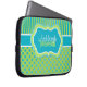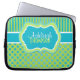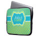 This personalised aqua blue, lime green, and white polka dots and stripes laptop sleeve has text boxes for you to customise with your own name, initials, business name, or other text. If you need any help customising, please email niteowlstudio@gmail.com.