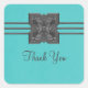 Regal and elegant Medallion Border Thank You Stickers featuring a digital art metallic medallion and a three stripe border on a turquoise background. These bold and stylish thank you stickers are perfect for an equally bold and stylish wedding and are great for favours or envelope seals. Easy to customise, simply add the details of your wedding in the text fields provided. Click on "Customise It" to find additional personalisation options such as changing fonts or text size.