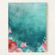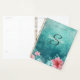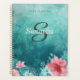 Aqua floral monogram planner for 2025 with pink flowers, a monthly overview, and weekly pages for 12 months of the year. Monogrammed with a name and initial. Personalise the front cover and choose between a soft or hardcover, and a gold, black, or white spiral.