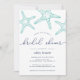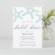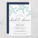 Our coastal chic bridal shower invitations feature classic nautical styling with a clean, minimalist look and a lighthearted touch of marine life. Design features three turquoise aqua starfish illustrations at the top, with your bridal shower details beneath in a chic combo of navy blue serif and sans serif lettering. Perfect for nautical, summer, or beach theme bridal showers.