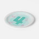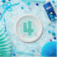 The number four is painted in aqua on a lighter aqua background. Four pink swirls are pictured around the four. They are printed on paper plates, for the fourth birthday.