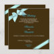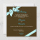Aqua blue ribbon on chocolate brown background. Elegant and simple wedding invitation. Size 5.25" x 5.25". Available in 4 sizes. Texts can be changed or deleted directly on the product page. Click "Customise It" button to change texts, fonts or colours. If you need help with the customisation of this product, please don't hesitate to send me a message. Ribbon is a printed image. Original design by ©Ruxique~Ruxandra Proksch.
