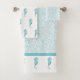 Beach house inspired bath towel set, with artwork of an aqua seahorse and aqua wave pattern. Lovely set for your beach themed bathroom and makes a great gift idea.