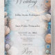 AVAILABLE WITH OR WITHOUT A QR CODE OR DINNER SELECTION OPTIONS. This design features a beautiful background of aqua, sand, blush pink, cream, and brown sea life. The text is displayed on a soft white transparent text area. The back continues the seashell background. Created by Simply Farmhouse Press.