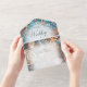 AVAILABLE WITH OR WITHOUT A QR CODE OR DINNER SELECTION OPTIONS. This design features a beautiful background of aqua, sand, blush pink, cream, and brown sea life. The text is displayed on a soft white transparent text area. The back continues the seashell background. Created by Simply Farmhouse Press.