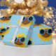 Yellow sunflower wearing turquoise polka dot sunglasses on polka dot background.