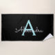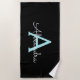 Black and Aqua Teal Blue Monogram Name Beach Towel. This makes the perfect sweet 16 birthday, wedding, bridal shower, anniversary, baby shower or bachelorette party gift for someone that loves glam luxury and chic styles.