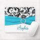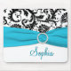 This elegant looking black and white damask mousepad has a PRINTED aqua blue ribbon and crystal brooch on it. Customise it with your own name, monogram, or other text.