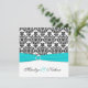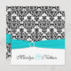 This black and white damask RSVP card has an aqua blue PRINTED ribbon and PRINTED diamond jewel brooch that would be perfect for an aqua and black themed wedding. If you re-size the invitation, or if you change fonts, or the size of the font, some of the design and/or text may get cut-off. Everything will print as you see it on your monitor. I will not see your invitation, and Zazzle will NOT correct anything (typos, mis-alignment etc.). The text and paper is all customisable. If you need help with this invitation, please email me BEFORE you place your order. If you require any other matching items, please email your request to niteowlstudio@gmail.com.