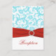 This aqua blue and white floral damask Reception Enclosure card has a red PRINTED ribbon and a PRINTED jewel buckle on it that matches the wedding invitation shown below. Some of the papers will alter the colour of the design, so use caution if you choose one of the paper types besides the basic white shown here. ALSO, if you re-size the card, or if you change fonts, or the size of the font, some of the design and/or text may get cut-off. Everything will print as you see it on your monitor. I will not see your card, and Zazzle will NOT correct anything (typos, mis-alignment etc.). The text and paper is all customisable. If you need help with this card, please email me BEFORE you place your order. If you require any other matching items, please email your request to niteowlstudio@gmail.com