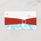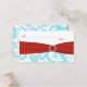 This aqua blue and white floral damask place card has a red PRINTED ribbon and a PRINTED jewel buckle on it that matches the wedding invitation shown below. **NOTE, if you change the size of the card, or if you change the fonts, or the size of the font, some of the design and/or text may get cut-off. Everything will print as you see it on your monitor. I will not see changes you make, and Zazzle will NOT correct anything (typos, mis-alignment etc.). The text is all customisable. If you need help with this product, please email me BEFORE you place your order. If you require any other matching items, please email your request to niteowlstudio@gmail.com