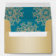 Gold look hued envelope with an exotic Indian inspired ornamental sari MEDALLION pattern WITH A FLORAL AND LOTUS SUNBURST DESIGN in aquamarine bluish green and gold on the inner flap of the envelope. This elegant and beautiful modern Indian style wedding invite is perfect for any formal occasion WITH AN EAST ASIAN INDONESIAN MOROCCAN ALADDIN OR ARABIAN NIGHTS THEME. Designed by Chrissy H. Studios, LLC. All Rights Reserved.