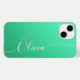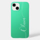 Aquamarine Shimmer White Elegant Calligraphy Script Custom Personalised Name iPhone 14 Smart Phone Cases features a modern and trendy simple and stylish design with your personalised name in elegant hand written calligraphy script typography on a metallic aquamarine shimmer background. Designed by ©Evco Studio www.zazzle.com/store/evcostudio