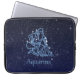 Laptop sleeve featuring the symbol for Aquarius in soft silver blue, overlaid with the stars of the constellation, against a starry sky background graded from deep midnight blue to black