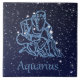 Tile featuring the zodiac symbol for Aquarius in soft silver blue, overlaid with the stars of the constellation, against a starry sky background graded from deep midnight blue to black.
