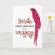 Ara Parrot Tropical Leaves Drawing Birthday Card. Ara pattern with tropical leaves and flowers in green and red colors. Happy birthday text and name on the front - add your name. Add your message inside or erase it.