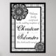 An elegant arabesque damask design in black and white featuring delicate circular motifs of various sizes in the corners and a repeating damask patterned background.
