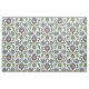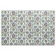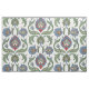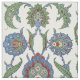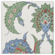 Arabesque ornate floral pattern in shades of olive green, cove blue and warm red. Leaves, stems, blossoms and forget-me-not style flowers. On white.