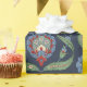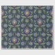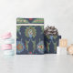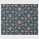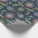 Arabesque ornate floral pattern in shades of olive green, cove blue and warm red. Leaves, stems, blossoms and forget-me-nots. On ebony clay blue background.