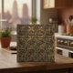 This highly detailed ceramic tile showcases a complex, repeating geometric pattern featuring an intricate arabesque of six-pointed starbursts and interlocking hexagons. The faux-dimensional, chiseled pattern is finished in a luxurious, textured oxidised bronze, evoking the rich patina of aged architectural metalwork. This sophisticated tile is perfect for creating an opulent, high-end statement and is ideally suited for Art Deco, Neoclassical, upscale industrial, or contemporary luxury décor applications like bar fronts, accent walls, and elegant foyers. Search ID1227 to see other metallic geometric designs in this series. Note: design adapted from generative content.