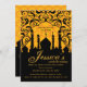 Arabian Nights, Gold and Black Invitation. Gold pillow style background with an Arabian city silhouette.