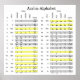 The Arabic alphabet with the numerical (abjad) values of the characters. Letters with a yellow background are “sun-letters” (to which the definite article is assimilated), gray areas mark “moon-letters” (where it is not).