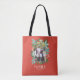This beautiful arch frame photo Christmas tote bag features hand drawn floral elements in various shades of green, mint, teal, off-white. Included are pine, flowers, sprigs, leaves, berries along with modern hand lettered in off-white, reading, "Merry Christmas." The background colour is a Christmas traditional, classical red. The back of the card has another place for a photo. Original Artwork by Caroline Bonne Müller
