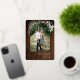 This design features watercolor holly and eucalyptus around an arched picture with a gold foil frame.