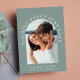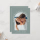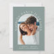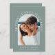 Modern casual sage green wedding invitation featuring your photo in an arched frame surrounded by "Nothing Fancy Just Love" in elegant white typography. Under your photo, add your first names, wedding date and location. On the reverse side, personalise your invitation in more detail in simple white typography.