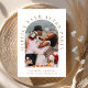 Elegant white elopement or private wedding announcement and reception invitation. The front features your photo in an arched frame, "Happily Ever After Party" in elegant gold typography and your first names, wedding date and location. On the reverse side, personalise your invitation and add your names in a signature-like gold script.