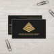 A minimal business card suitable for an architect, engineer, builder & more. The modern design features a gold pyramid logo on the front with a black background and space for your business name. On the back your name, contact information, & the option to add a tagline or services offered.