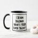 Funny slogan on a mug that says "I Design Buildings. what's YOUR super talent?". Two Tone Mug for an Architect. Black and white bold text.