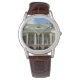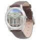 This watch displays classical architectural elements on a facade such as a pediment, cornice, eyebrow window and brick arches. A beautiful brown leather band complete it. Perfect for the lover of architecture in your life!