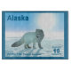 White on white. A 10-Nugget postage stamp issued by a mythical independent nation of Alaska. Features a digital painting of an Arctic Fox, Vulpes lagopus, on the polar ice. The sun hangs low in the bright blue arctic sky. Do not stare at the sun as it can harm your eyes. Text reading, "Alaska," "POSTAGE 10 NUGGETS," "Arctic Fox," and "Vulpes lagopus" also appear. The Arctic Fox is comfortable in deep cold; it does not begin to shiver until temperatures drop to about −70 °C (−94 °F) due to its dense, multi-layered fur. Other adaptations to a frigid climate include fur on the soles of its feet, short ears, and a short muzzle. Arctic foxes live in burrows, in a blizzard they may tunnel into the snow to create shelter. The coat of the Arctic fox, sometimes blue-grey, is very effective winter camouflage. The natural hues allow the animal to blend into the environment. During the short warm season its coat changes to brown or grey, again acting as camouflage in tundra rocks and plants. During the winter, when prey is scarce, the foxes follow hunting Polar Bears on the ice pack feeding on scraps. During the summer the eat rodents, birds, eggs, and even fish. They will also feed on berries and seaweed. Arctic Foxes have extremely keen hearing, aided by their wide, front-facing ears, which allow them to locate the precise position of their prey beneath the snow. If it hears something moving under the snow it leaps into the air and pounces, punching through the snow to catch its prey. The range of the Arctic Foxes is circumpolar; they can be found throughout the far north. The only land mammal native to Iceland, it arrived by walking oversea ice at the end of the last ice age.