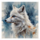 An Arctic Fox with detailed watercolor with expressive eyes is portrayed against a soft, blurred background. The natural colours enhance the lifelike appearance.