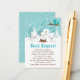 This cute and fun book request enclosure card features an adorable arctic fox family in a winter wonderland setting with snow capped trees and a blue bird on a branch with holly. In the background is a teal blue green sky and falling snowflakes. The text combines decorative and sans serif fonts for a stylish and modern look. This is perfect for a Christmas or winter themed baby shower.