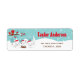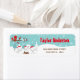 This cute and fun address label features an adorable arctic fox family in a winter wonderland setting with snow capped trees and a red bird on a branch with holly. The foxes in Santa hats add a festive touch. In the background is a teal blue green sky and falling snowflakes. The text combines decorative and sans serif fonts for a stylish and modern look. This is perfect for a Christmas themed baby shower, birthday and more.
