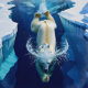 Arctic Mirage: The Swimming Monarch. A stunning visual of a majestic polar bear emerging from the icy water, captured in fluid stylised watercolour strokes. The interplay of light and water creates an ethereal effect, as if the polar bear exists between two worlds - reality and dream.