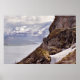 Late Spring in Tromsø, Norway. Dramatic view of steep snowy mountains meeting icy waters of the Arctic Sea and creating dangerous and beautiful wonder called fjord.