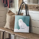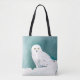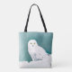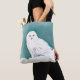 A snowy owl in the arctic snow if winter with a teal blue sky