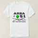 Silhouette images of a barbed wire and a green winking and smiling alien's face. Flying saucer to the left of the extraterrestrial's face. The text Area 51 above the images, the text Not for Earthians under the images. Funny customisable t-shirt for anyone. White background. You can change or delete all the texts and images. Do not forget to choose another colour, style, the gender of the apparel, more than 150 styles are available. Have fun!