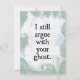I Still Argue With Your Ghost - poignant text abstract with seafoam green swirls over a white background with lavender and yellow accents.