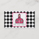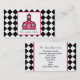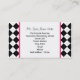A teacher business card featuring the logo of The Pink Schoolhouse on front inside a white square outlined in pink. Background on front and back is black argyle. Personalise the text on front and back with your information.