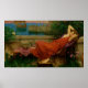 Ariadne by John William Waterhouse shows a quiet, dreamlike moment after mythic drama. Ariadne lies stretched along a stone terrace, her body relaxed and her eyes closed as if caught between sleep and waking. A deep red robe drapes over her figure in soft folds, with violet fabric and scattered flowers adding touches of luxury and tenderness. Nearby, a great spotted cat rests like a guardian at her side, echoing the painting’s mood of watchful stillness.